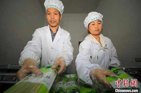 工人在貴州省江口縣雙江街道一傢食品加工企業為抹茶面條裝袋。 李鶴 攝