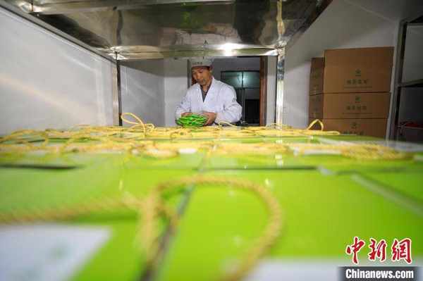 工人在貴州省江口縣雙江街道一傢食品加工企業整理加工好的抹茶面條。 李鶴 攝
