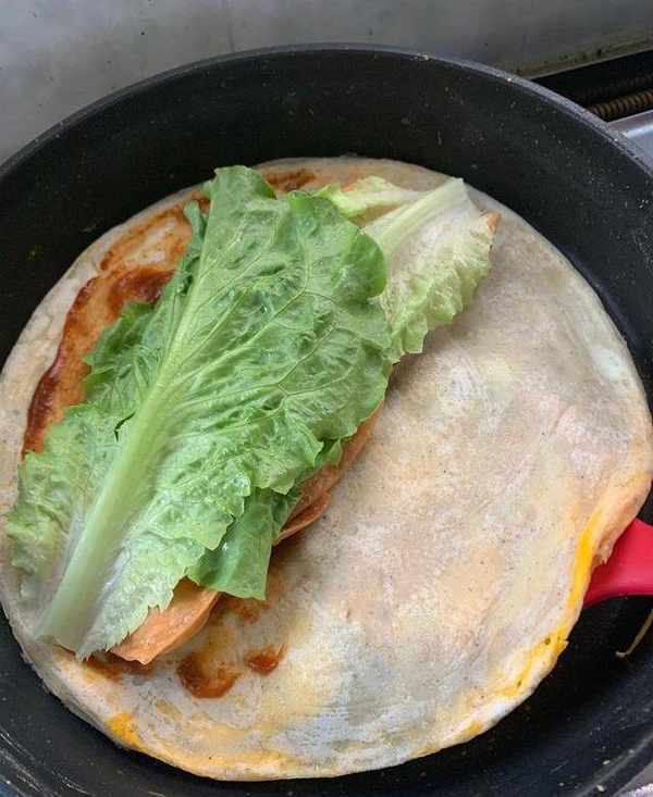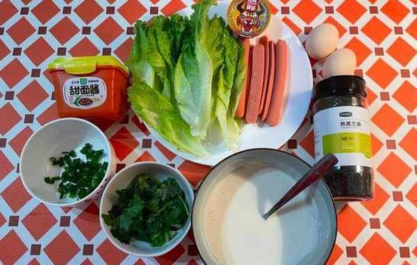 步驟五:薄脆、(傢裡沒有薄脆也可以不放)火腿腸、生菜(傢裡有寶寶的可以把生菜切碎)