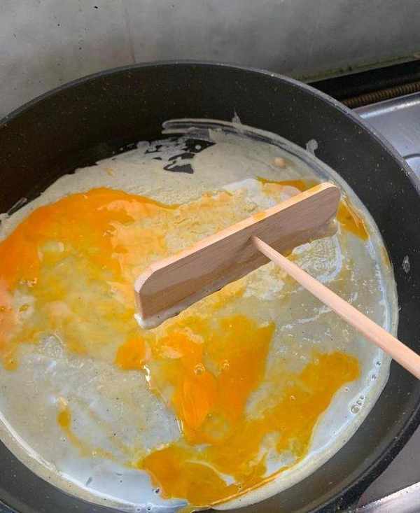 步驟二:平底鍋中加熱三分鐘,(一定要掌握好火候,火大瞭會糊,火小瞭不會攤成餅)鍋熱舀一勺面糊倒進鍋裡,用鏟子或刮板薄薄的鋪滿鍋底,凝固瞭打一個雞蛋在上面