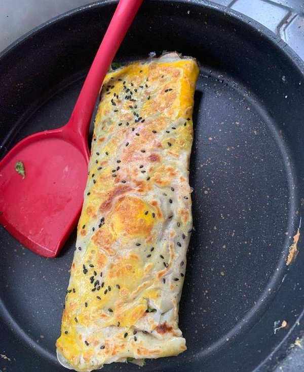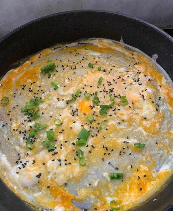 步驟三:雞蛋半凝固狀態撒蔥花、香菜、黑芝麻