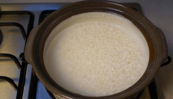 3.米淘洗幹凈後倒入鑄鐵鍋,加入適量水(大概自己的食指豎著放下去的話,水面到食指第一節的二分之一偏上一點點)