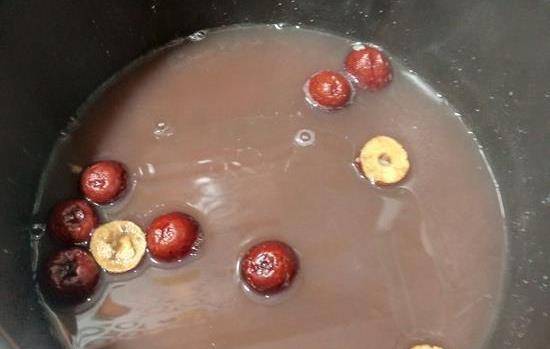 第四步:煮到約8分熟時,加入適量的大米,紅糖,紅棗,繼續煮制10分鐘左右。煮熟後,關火盛出即可。