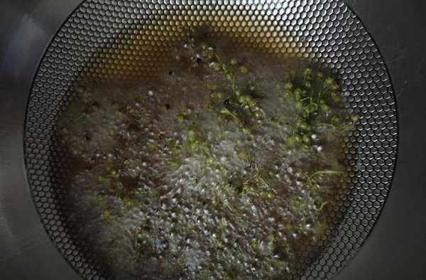 再談談油溫的問題,去年也做過花椒油,油溫過低,新鮮花椒的濕氣沒有完全釋放,導致花椒最後在油裡發瞭黴。有人說油溫要燒到六七成熱,我覺得不夠,所以今天將油溫燒得很高,花椒在高油溫裡已炸熟,再也不擔心花椒發黴的問題。
