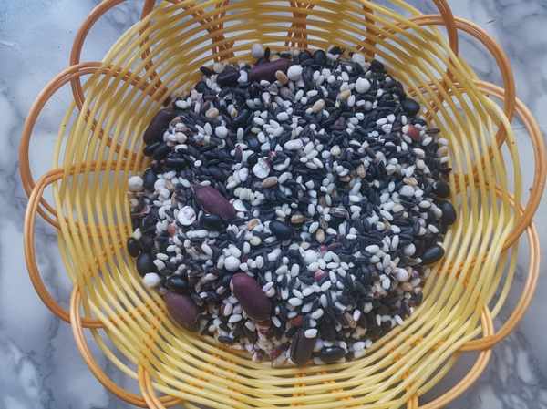 第二步:今天我們用電壓力煲在做粥,所以把黑米,黑豆,黑花生米,血糯米,圓糯米,高粱米,芡實,黑麥仁,西米全部放到碗裏,一起清洗乾淨。