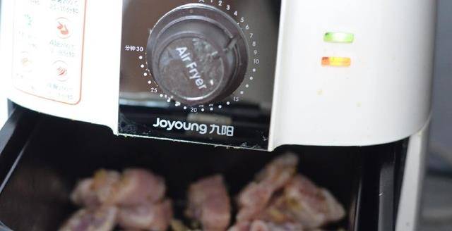 3.空氣炸鍋預熱後將排骨放在炸籃中,設定200度20分鐘,啟動炸鍋。(時間溫度做為參考,以烤箱的實際情況調整)