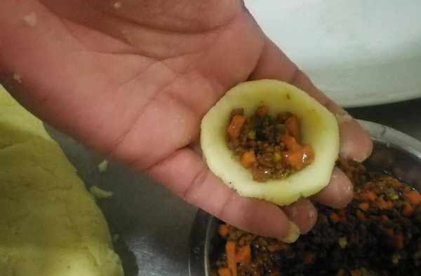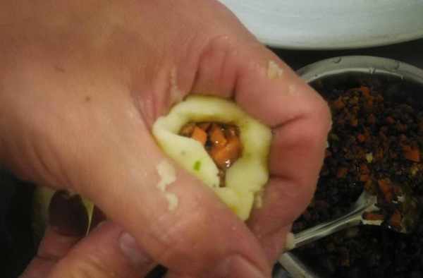 7、土豆面搓成長條,切一團面劑子,搟成圓餅,中間放炒好的餡料,包起來,收口;