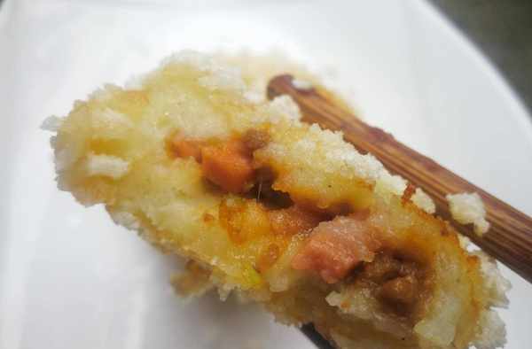 食材:土豆,面粉,火腿腸、小蔥、雞蛋、面包糠、薑