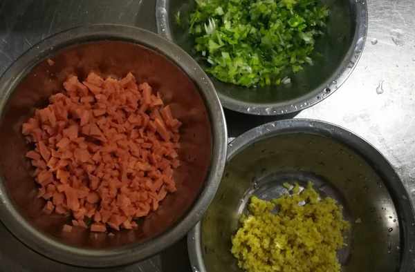 2、蒸土豆的時候,火腿切丁,蔥切末,薑切末;