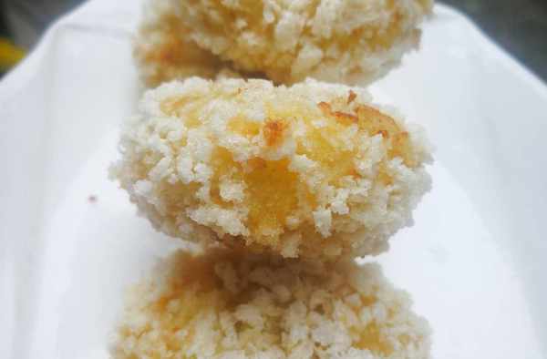 8、雞蛋打成雞蛋液,把做好的土豆餅放在雞蛋液先過一下,然後放在面包糠上面,表面均勻包裹上面包糠;
