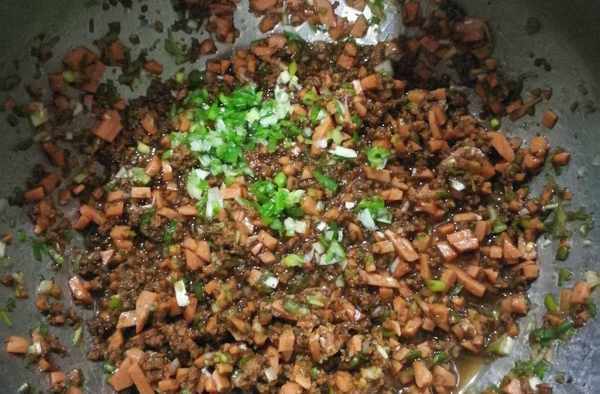6、鍋內放油,炒火腿丁,加入蔥末,加鹽,加少許生抽,加胡椒粉,出鍋後再撒上少許蔥花;
