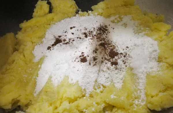 4、在壓好的土豆泥上加面粉,撒花椒粉;