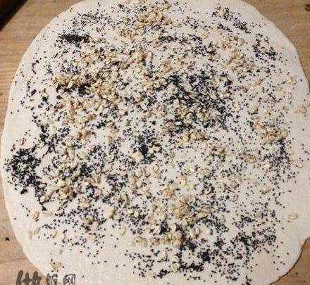 5.先塗上一層水,然後依次撒勻燕麥片,黑芝麻和鹽。