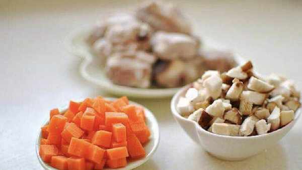 1.將買來的排骨清洗幹凈,隨後放入鍋裡焯一會撈出,去除血水。胡蘿卜和香菇切成丁備用。