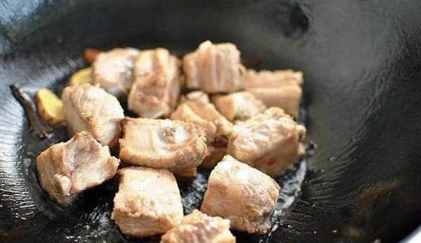 2.鍋裡放入適量的油,隨後加入薑片八角爆香後,而後放入排骨及冰糖,翻炒至表面微黃。