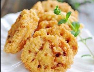然後在碗裡打進去兩個雞蛋攪拌均勻,另外一個碗倒入一些面粉和適量的淀粉,一個雞蛋,少量的啤酒和水攪拌成流動的糊狀,接著把蓮菜先輕輕蘸一點面粉,然後沾上蛋液,最後再掛糊,鍋面糊的時候盡量薄一點,不然太厚也會影響口感的,鍋裡加油,燒至6成熱的時候轉成中火,把臉頰一個個放進去炸,炸至定型表面金黃,撈出來放涼,然後再炸一次,等到表面金黃就可以吃瞭。