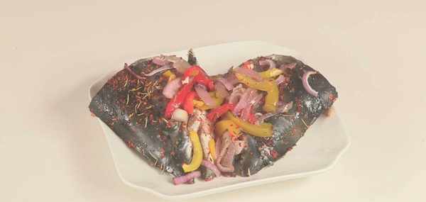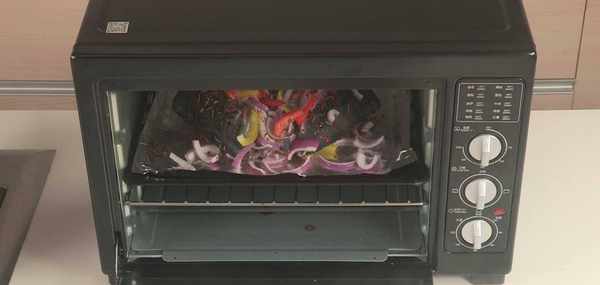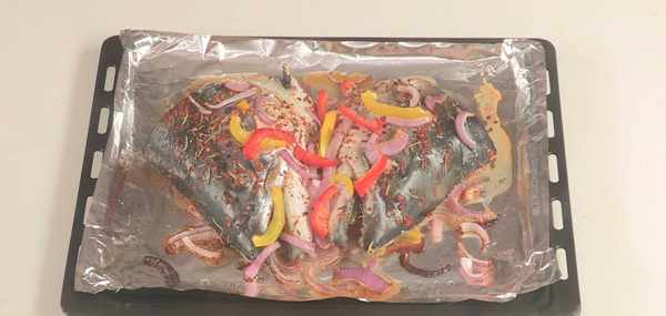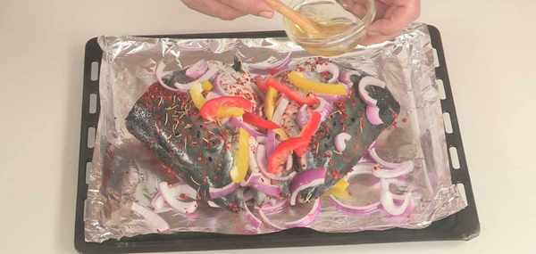 7 放入適量洋蔥、黃彩椒、紅彩椒,扣上三文魚頭,再放入剩餘的洋蔥、黃彩椒、紅彩椒,淋上適量食用油。