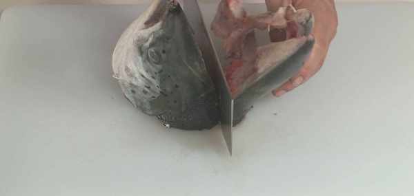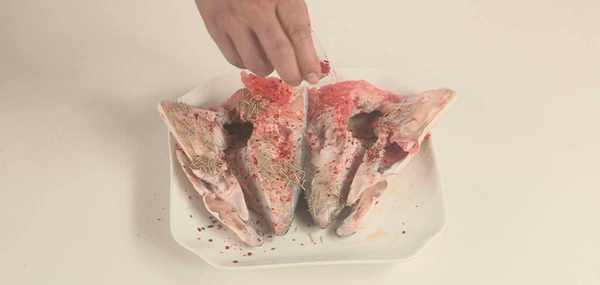 5 在三文魚頭上撒鹽、料酒、香草料、辣椒粉,醃漬20分鐘,待用。