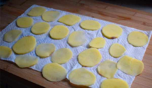 2、土豆片泡好之後繼續清洗至清水變得不再渾濁,然後放到廚房紙上吸水(小廚心得:一定要將土豆片上的水分吸幹,不然烤出來的薯片不夠幹脆);