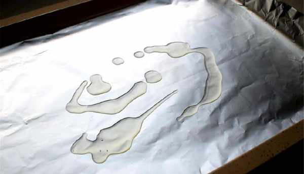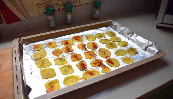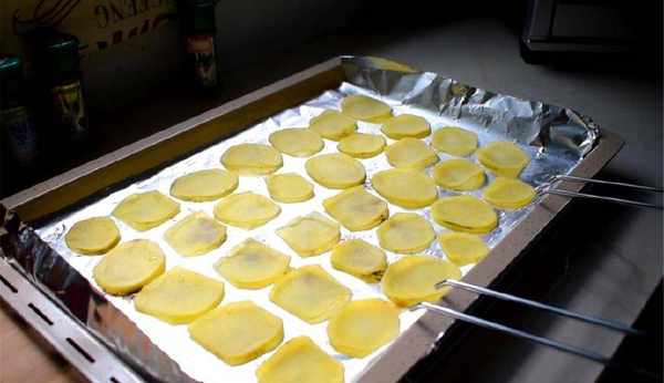 3、烤盤上鋪上錫紙,然後再刷上一層薄油,將吸幹的土豆片整齊的擺在上面(小廚心得:刷薄油是為瞭防止烤制的土豆片會粘連烤盤,後期好處理);