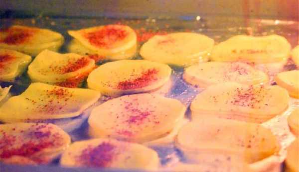 1、將土豆清洗幹凈之後切片,放到鹽水裡浸泡,泡至土豆片邊緣微卷(小廚心得:如果對自己的刀工不夠有信心,最好還是選用削皮器削片,這樣比較均勻好烤);
