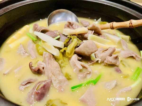 除瞭當地著名的竹筍,鄰間裡還有一道讓廣東人也頗為驚喜的是農傢酸菜豬肚煲,打破瞭我對隻有廣東人才能懂豬肚烹飪的刻板印象,因為這道好吃的農傢酸菜豬肚煲,也是安吉一道著名的傢常菜。