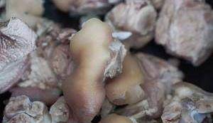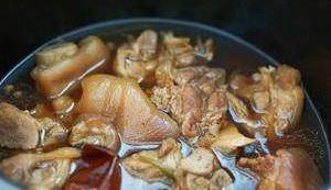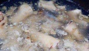 豬蹄處理好毛,清洗幹凈。冷水下鍋,放5片薑將豬蹄焯水。