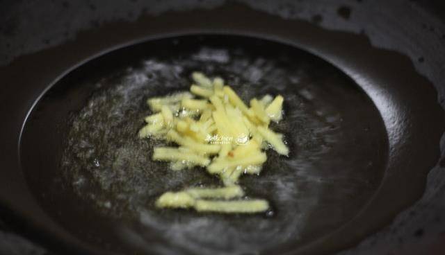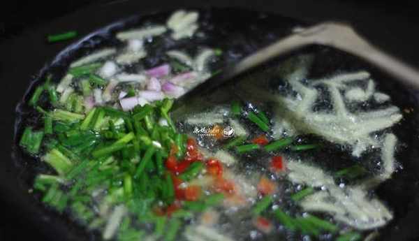 2熱油爆香薑絲和蔥粒,有點像蔥油的做法,這樣能去掉魚腥還能帶出薑蔥香味。