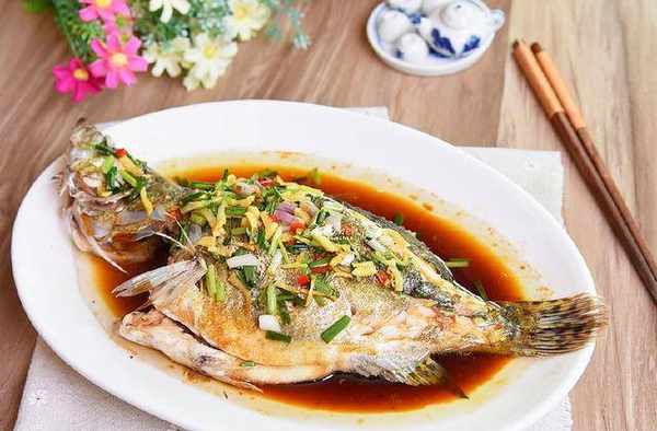 8、 把炒鍋裡的薑絲、蔥粒和熱油淋在桂魚身上。