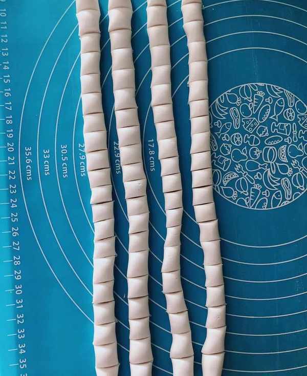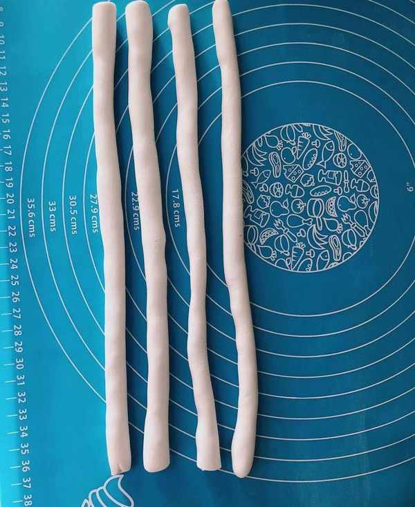 3、搓成幾條細細的長條,不要太粗