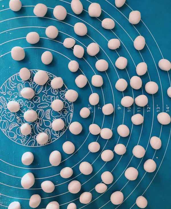 4、將長條切成小段,揉成小丸子,可以一個個用手揉,也可以在案板上揉,總之搓圓搓扁,全看手技