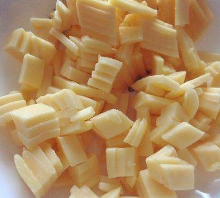將百吉福芝士切碎備用。此時可以預熱烤箱,180度10分鐘