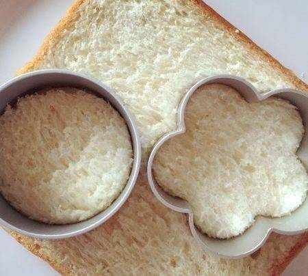 借助模具或小杯子口,將吐司面扣成圓形(能放入瑪芬模具即可)