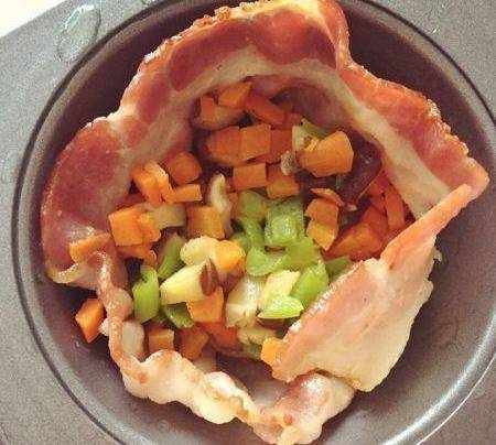 用培根搭配雞蛋,如果不想吃全熟雞蛋,減少烘焙時間就好