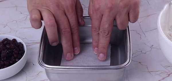 步驟6:準備一個盒子,放上一張烹飪紙,防止做好的松糕粘鍋底。