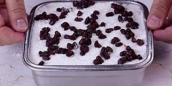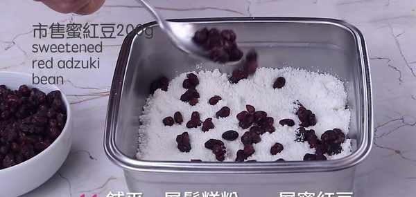 步驟7:過篩好的粉舀入保鮮盒中,鋪平一層松糕粉、撒上一層蜜紅豆,重復至裝滿容器。