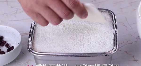 步驟8:等米粉沒過瞭盒子邊緣,用刮刀輕輕刮平。