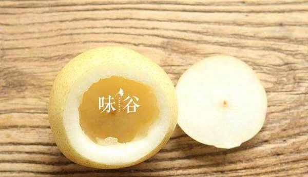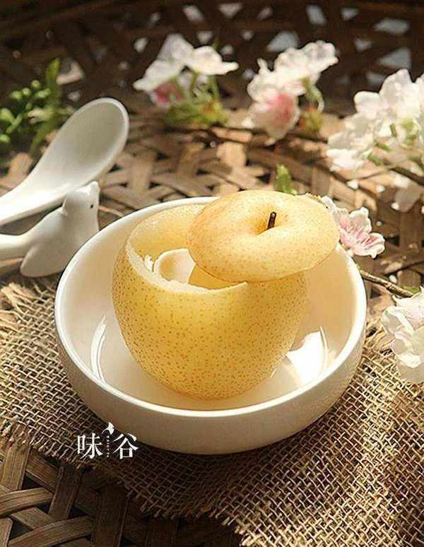 3、雪梨洗幹凈,切去上面四分之一處用湯匙把雪梨心挖掉,成一個梨盅。小心別挖穿底部。