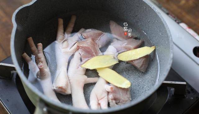 3.把雞腳、瘦肉和生薑片放入冷水鍋中,大火煮沸2分鐘,汆燙掉肉類的血水和雜質。