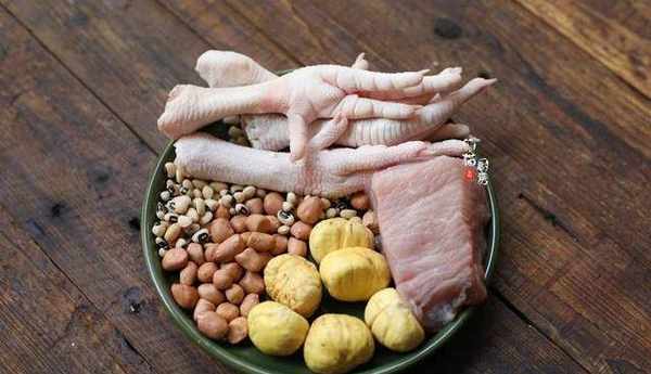 食材:新鮮雞腳3-4隻,瘦肉200克,板栗5-6顆,花生20顆,眉豆15克,生薑1塊,鹽適量,清水4碗。