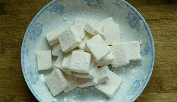第三步、豆腐浸泡完後,放到幹凈碗裡,再撒上點淀粉,之後可以沾一點雞蛋液,看各自口味,如果不喜歡也可不加。