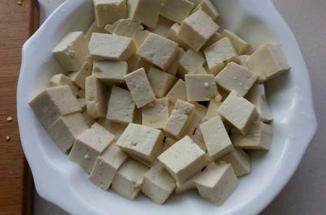 第一步、備好豆腐用涼水清洗一遍,然後在切成小方塊,在放到碗中倒入少量清水,加入適量鹽浸泡15分鐘左右,這樣可以把豆腐裡面的腥味去掉,還能讓豆腐變得有咸味。
