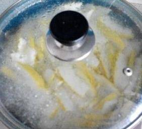 3.等水燒開後,倒入柚子皮進去,然後煮個30分鐘左右(煮的時間久一點,這樣甜味可以滲透進去,吃起來也會更加的好吃呢)