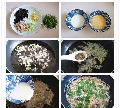 1,木耳泡發,洗凈後切成絲。熟肉,切丁。蔥和薑切成末,香菜切段。