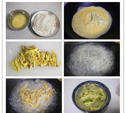6,把雞蛋絲倒進來,再煮三五分鐘。最後加鹽、胡椒粉、香油調味就好瞭。