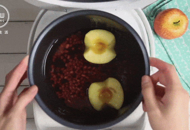 1. 將紅豆、紫米、蘋果、水放入電子鍋,以【煮粥】模式煮熟。