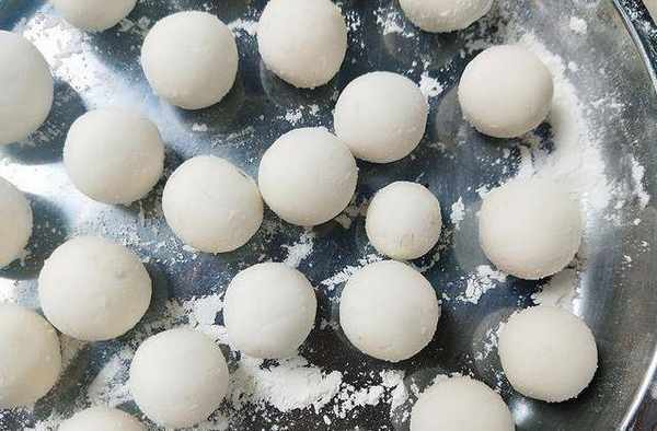 3、將揉好的面團小塊小塊的揪下來,搓成圓球,撒上一些幹糯米粉,放在冰箱裡冷凍起來,然後用同樣的辦法制作紫薯和南瓜糯米丸子就行。