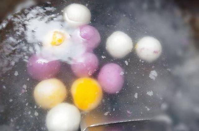 4、開火坐鍋,倒入開水,將提前做好的三色糯米丸子放入水中,煮上五分鐘,直到糯米丸子浮起來為止,然後倒掉大部分的水,留下適當的分量即可。