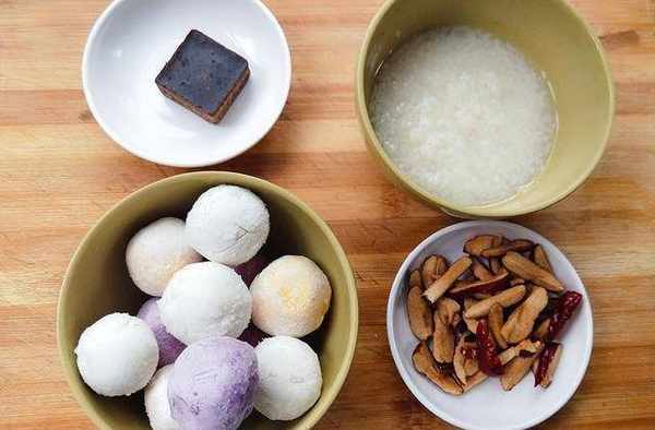 三色糯米丸子十來個,白色的是山藥糯米丸子、紫色的是紫薯丸子、橘黃色的是南瓜丸子,這個是提前做好,放到冰箱裡冷凍起來的。甜酒釀2湯匙,有的地方叫它為醪糟,也有的叫它米酒,反正別名挺多,我們習慣叫它甜酒。小紅棗六顆,切成小塊,紅糖一塊。最後在小碗中放入半湯匙紅薯淀粉,加少量水兌成水淀粉。