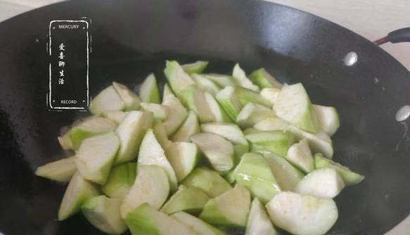 2,鍋中加入2勺食用油,油熱倒入雞蛋液,炒至凝固後,盛出備用,倒入剛才醃制好、控幹水分的絲瓜,利用餘油,翻炒至斷生。